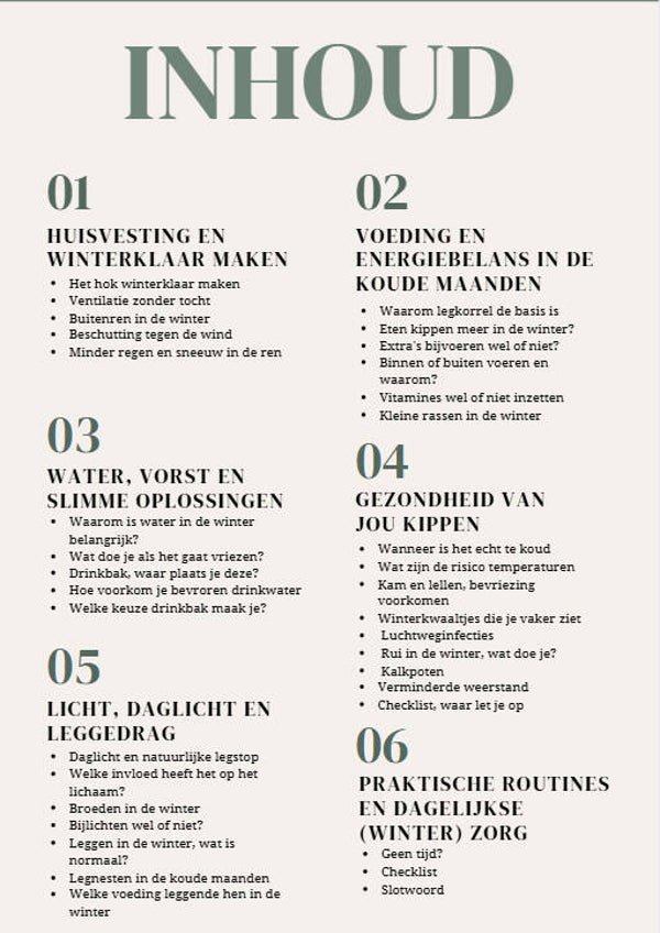 In plaats van elke dag te twijfelen of je iets vergeten bent, zorgt een vaste routine voor rust. Met de checklists en dagschema's uit het e-book weet je precies waar je op moet letten. Zo ben je in weinig tijd klaar en weet je zeker dat jouw kippen optimaal de winter doorkomen.